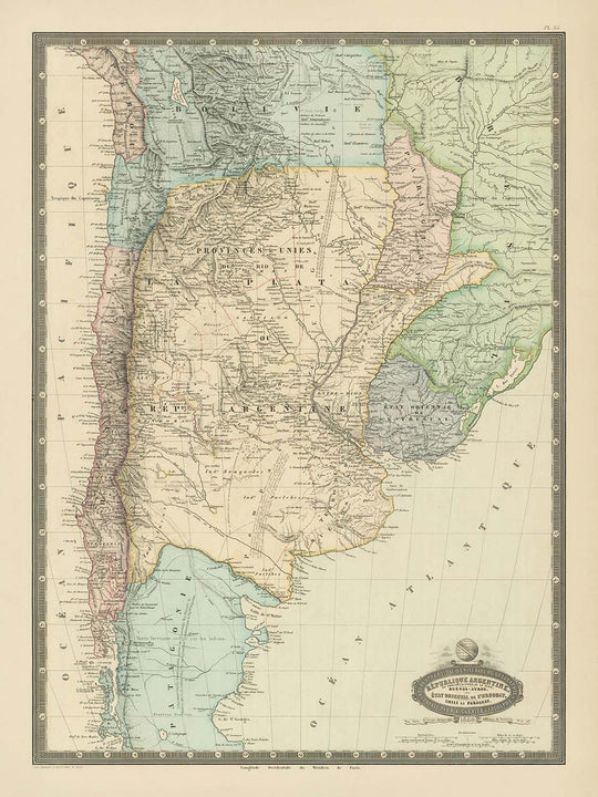 The map’s artistry is evident in its careful rendering of the continent’s major rivers—the Paraná, Uruguay, Paraguay, Colorado, and Negro—each lifeline snaking through the heart of the land. The mighty Andes Mountains, labeled as the "Cordillère des Andes," form a dramatic western spine, while the vast plains of the Pampas and the rugged wilds of Patagonia evoke the untamed spirit of the era. The inclusion of the Rio de la Plata and the iconic Strait of Magellan further enriches the map, anchoring it in the great narratives of exploration and commerce.