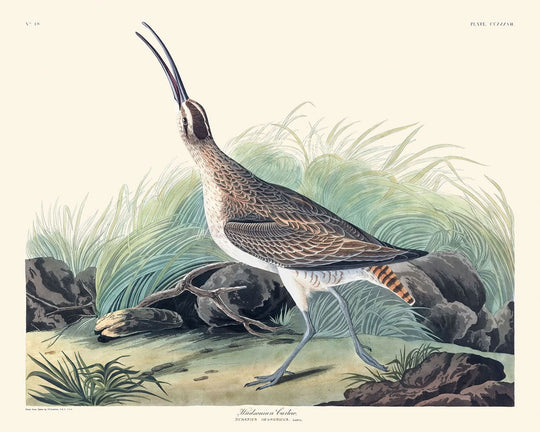 Hudsonian Curlew, first published in 1827, is one of the engaging illustrations from John James Audubon's celebrated work, "The Birds of America." This exquisite portrayal captures the allure of the Hudsonian Curlew (Numenius hudsonicus) with emphasis on its elusive nature and the intricate beauty of its habitat.