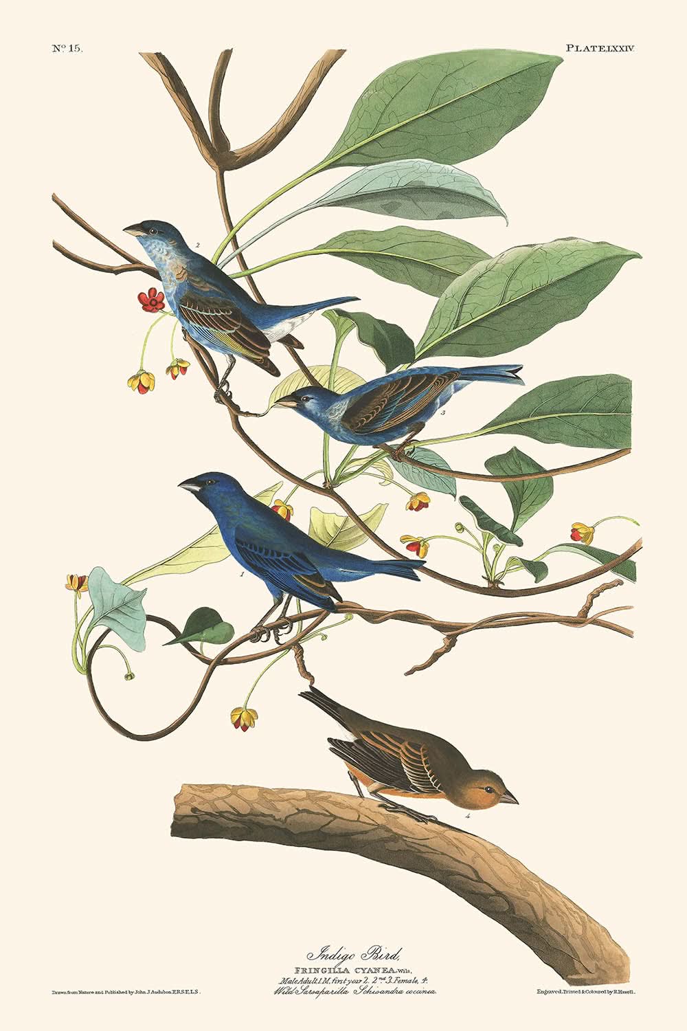 This bird illustration offers an intriguing glimpse into both the scientific and cultural history. The Indigo Bunting's beautifully detailed form and hue were meticulously observed by Audubon in its natural habitat, amidst the wild sarsaparilla of Louisiana's forests and fields.