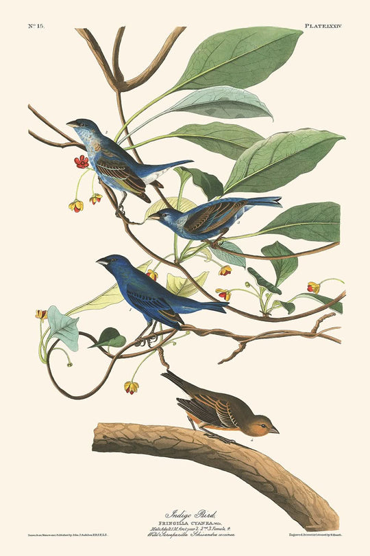 Audubon was a pioneer in ornithological art, bringing to life the visual splendour of American bird species. His work is lauded for its accuracy and artistic achievement, as seen in the Indigo Bird's striking azure plumage, which shimmers with hints of green in the light—a testament to the artist's skilled hand and love for his avian subjects.