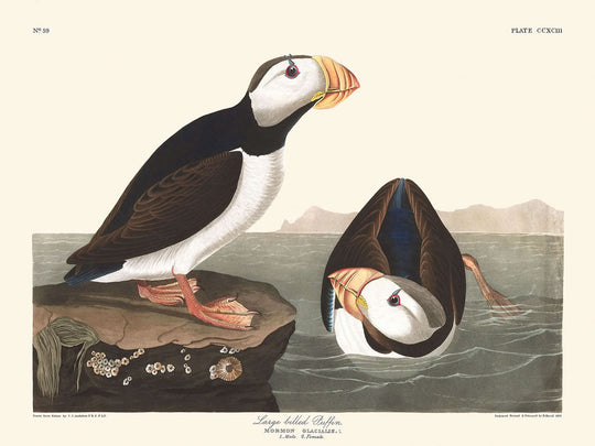 Large Billed Puffin, crafted by the adept hand of John James Audubon in 1827, is a captivating bird illustration from his renowned collection, Birds of America. This artwork exudes the intrinsic charm of Audubon's passionate study of avian life, rendering an exceptional glimpse into one of North America's rarest bird species through his unique artistic lens.