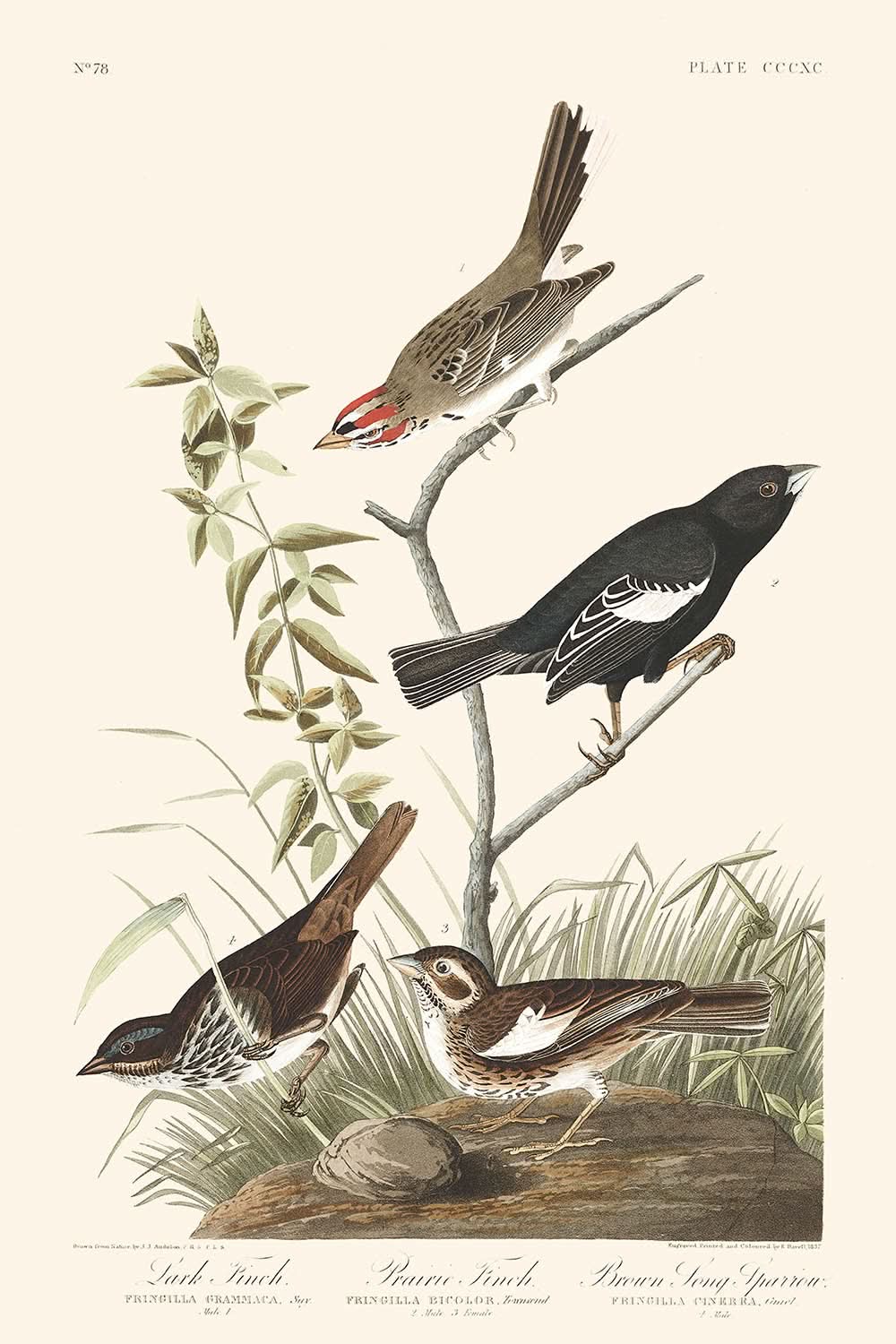 Lark Finch, Prairie Finch, Brown Song Sparrow is a captivating illustration crafted by the renowned artist John James Audubon, first published in 1827. As part of his monumental collection, Birds of America, this artwork exemplifies Audubon's dedication to capturing the natural beauty of North American bird species.
