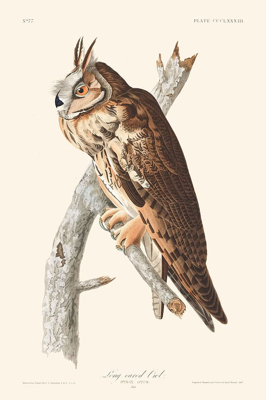In this illustration, the exhibition of color—a medley of buff, mottled with brown and greyish-white tones—melds seamlessly with the owl's natural environment. The intricate patterns on its feathers and the distinct structure of its elongated tufts epitomize Audubon's mastery in replicating nature's vibrancy onto paper. This print not only appeals to art connoisseurs but also serves as a beautiful addition to the collection of anyone passionate about ornithology.