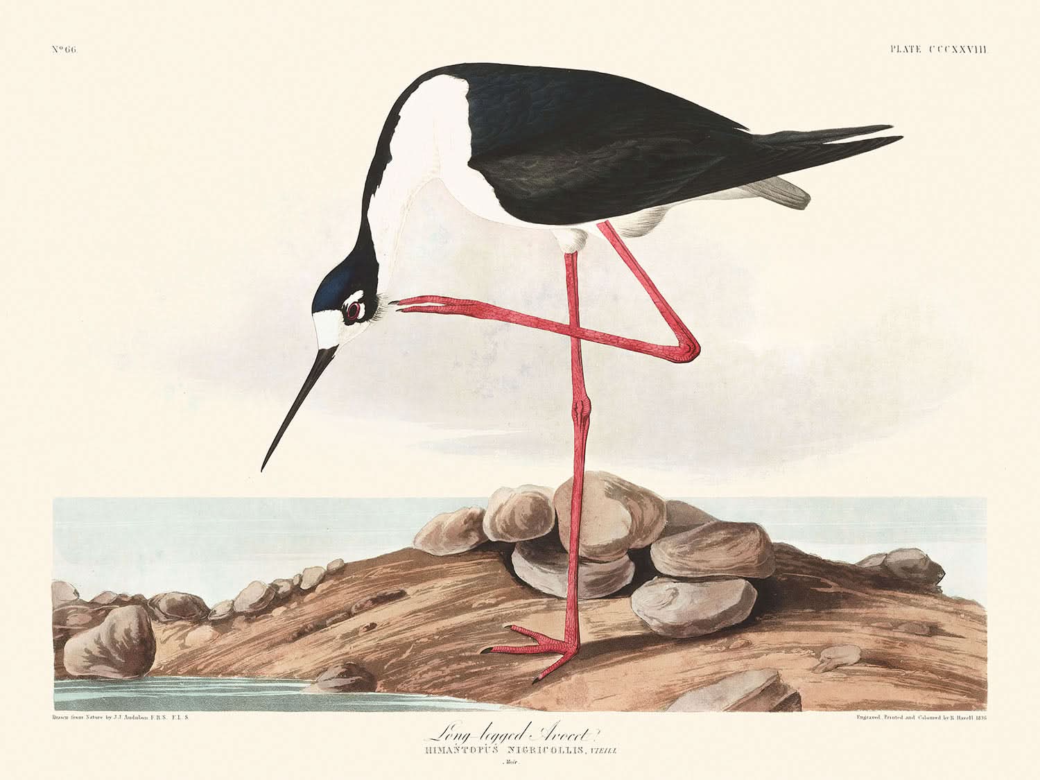 Long-legged Avocet, published in 1827, is a captivating bird illustration from John James Audubon's renowned collection, Birds of America. This illustration showcases the elegance and distinctive features of the Long-legged Avocet, drawing attention to its slender, elongated legs and graceful posture—a tribute to Audubon's skill in capturing the essence of American wildlife.