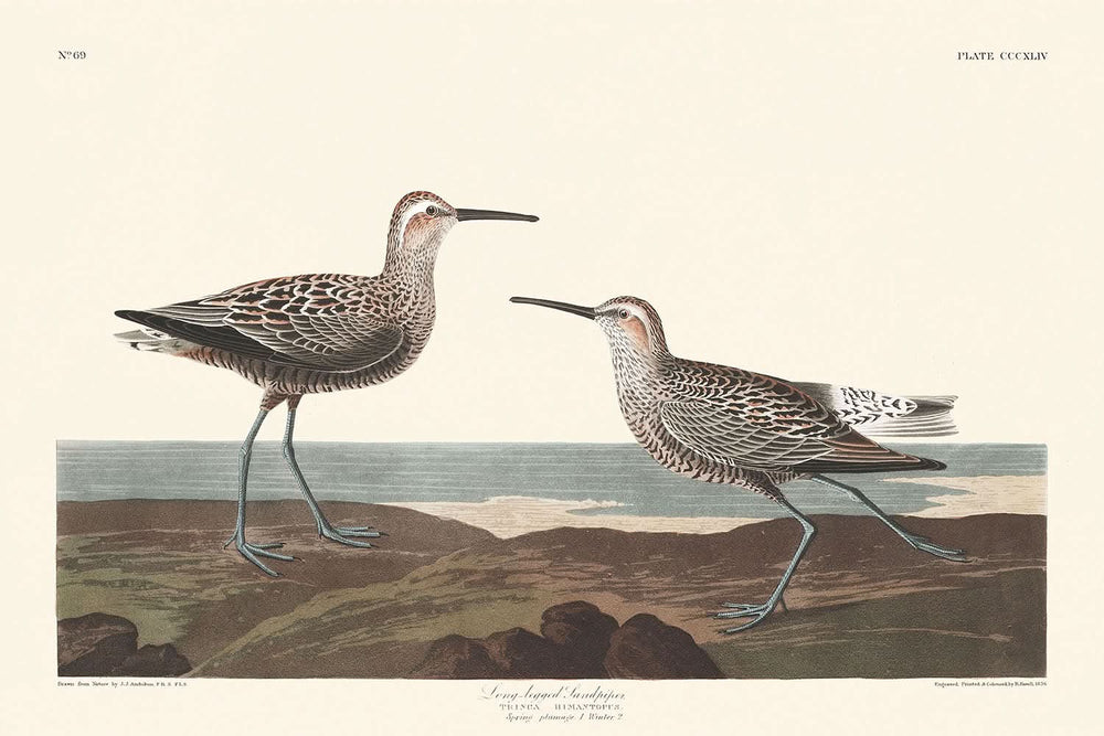 Introducing "Long-legged Sandpiper" by the renowned naturalist and artist John James Audubon, this exquisite illustration first published in 1827, is a remarkable piece from the celebrated "Birds of America." Audubon’s work is a testament to a bygone era of meticulous natural observation and artistic skill, capturing the beauty and essence of the avian world with unparalleled detail.