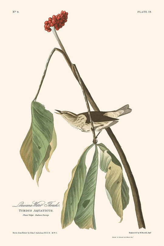 The depiction of the Louisiana Water Thrush is notable for its intricate portrayal of the bird's song and behavior. Audubon admired this bird's musical ability, comparing it to the Nightingale. The scientific name for the Louisiana Water Thrush is Seiurus motacilla, further enriching the piece with its historical and biological significance.