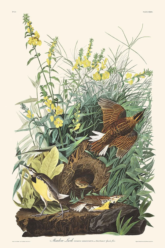 "Meadow Lark," a captivating bird illustration by the renowned John James Audubon, comes from his seminal work, "The Birds of America," first published in 1827. This illustration is a testament to Audubon's deep immersion in the natural habitats of these beautiful creatures, echoing his experiences amidst the lush, idyllic fields near the seashores of the Jerseys during the vibrancy of early spring.
