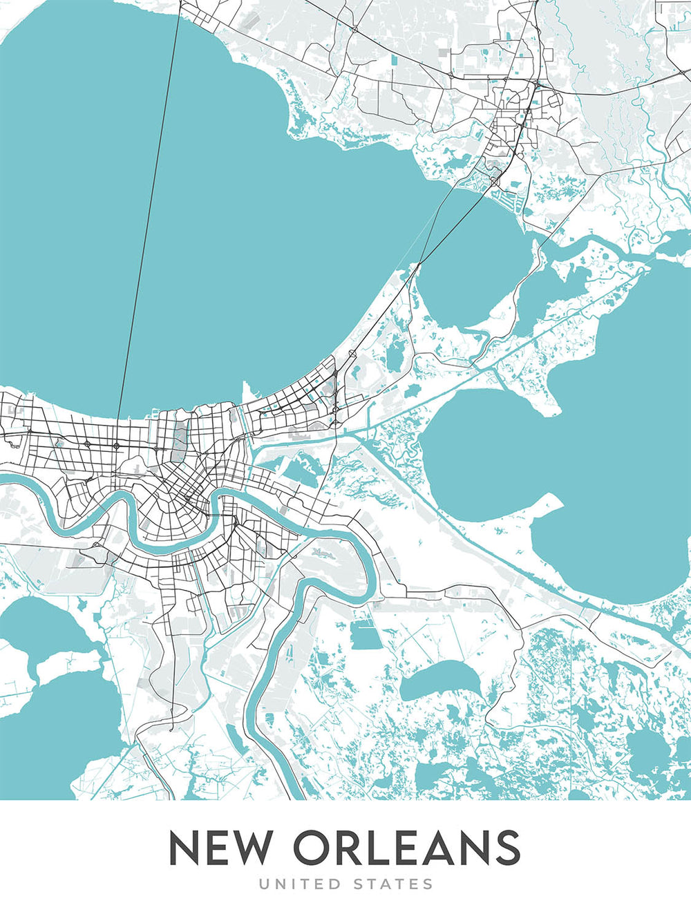 This map of New Orleans, Louisiana, is a modern, detailed street map without labels. It focuses on the city of New Orleans and the surrounding areas, providing an accurate and visually appealing representation of the city's layout. The map covers a wide range of neighborhoods, including the historic French Quarter, the Central Business District, the Garden District, Metairie, Algiers, Treme, Bywater, Marigny, Faubourg St. John, and Gentilly.
