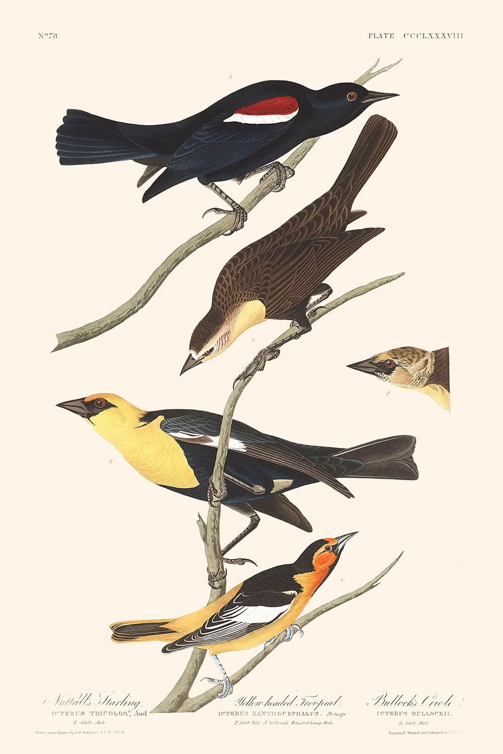 The artwork itself showcases three species: the Nuttall's Starling, Yellow-headed Troopial, and Bullock's Oriole. Rich in color and detail, Audubon's representation of these birds provides an extraordinary glimpse into their natural behavior and habitat. The Yellow-headed Troopial (Icterus xanthocephalus) is especially notable, with its striking orange-yellow head juxtaposed against the glossy black body, conveying both elegance and distinctiveness in its design.
