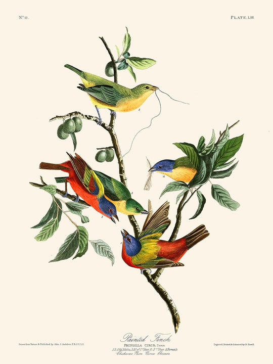 Painted Finch (Plate 53) exemplifies Audubon's masterful attention to detail and the intricate beauty of the avian world. His work is distinguished by lifelike portrayals with delicate brushwork that captures the vibrant plumage and distinctive forms of each species. The colorful depiction of the Painted Finch in its natural habitat demonstrates Audubon’s unparalleled talent and his ability to bring the observer closer to nature.