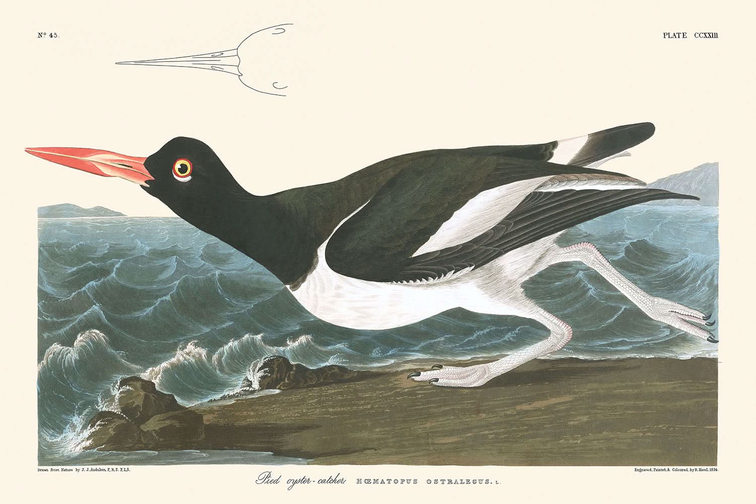 Pied Oyster-catcher, first published in 1827, is a striking bird illustration by the renowned naturalist and painter John James Audubon. This piece is part of Audubon's groundbreaking work, Birds of America, an extraordinary collection highlighting the diverse avian species found across the continent.