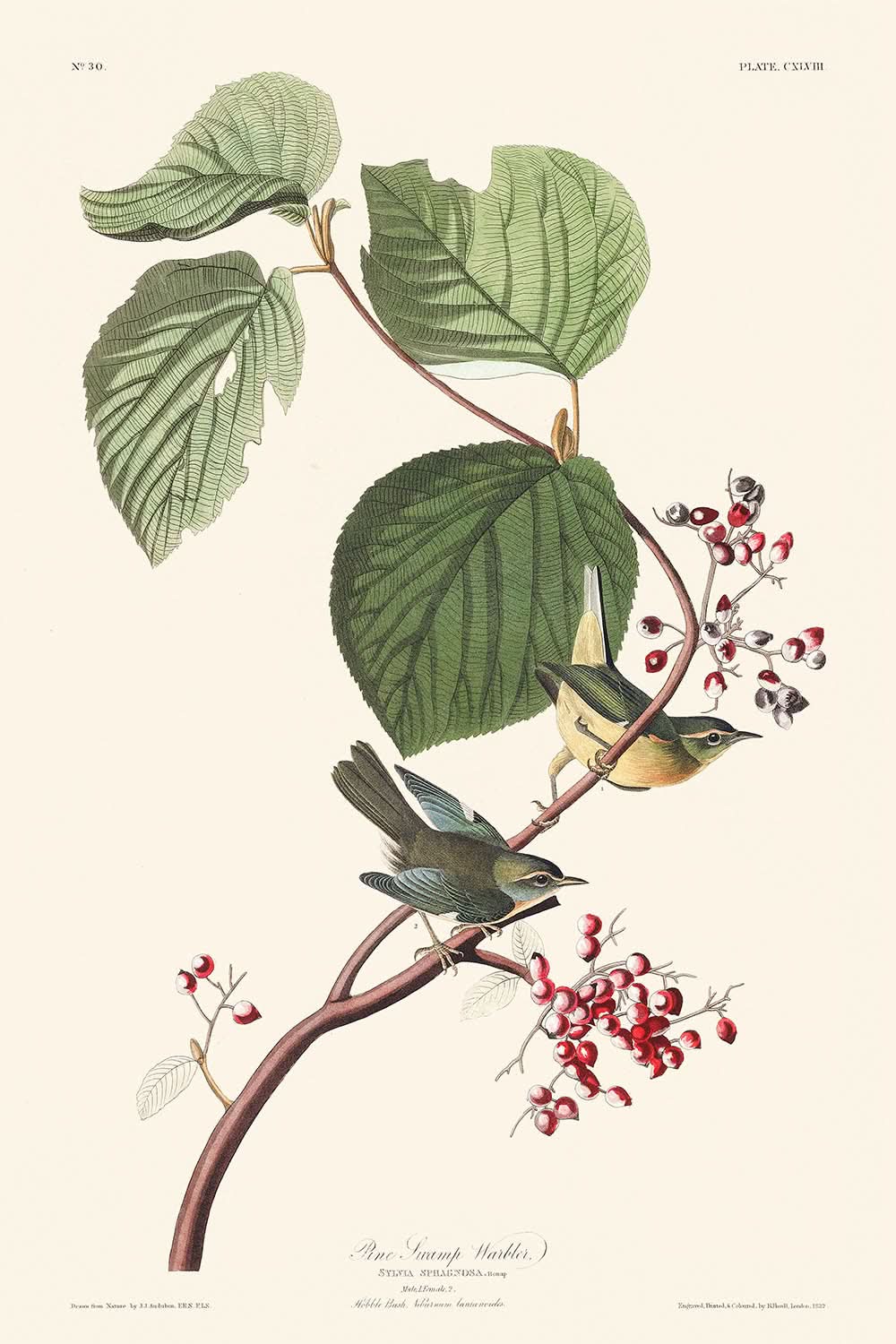 Discover the captivating beauty of the Pine Swamp Warbler, printed from the illustrious Birds of America by John James Audubon, first published in 1827. This bird illustration showcases Audubon's extraordinary attention to detail and mastery in portraying the vibrant world of avian life.