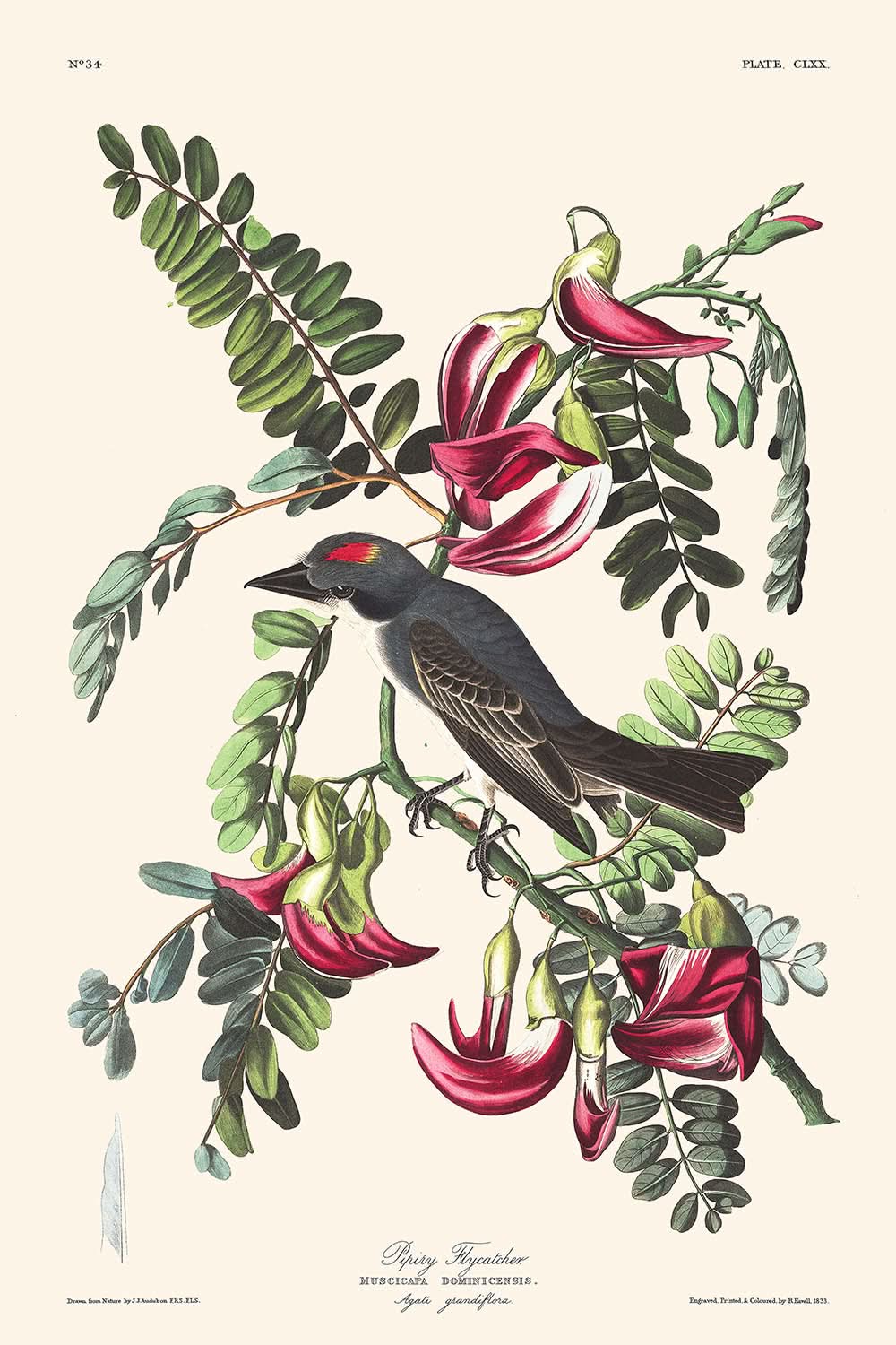 The Piping Flycatcher illustration is a testament to Audubon’s skill in portraying avian subjects with remarkable realism. The dynamic composition and precise coloration reflect the artist’s adept use of style and design, making this print a conversation starter and collectibles item for any art collection. The scientific designation for this species enhances its value for both art lovers and avian enthusiasts.