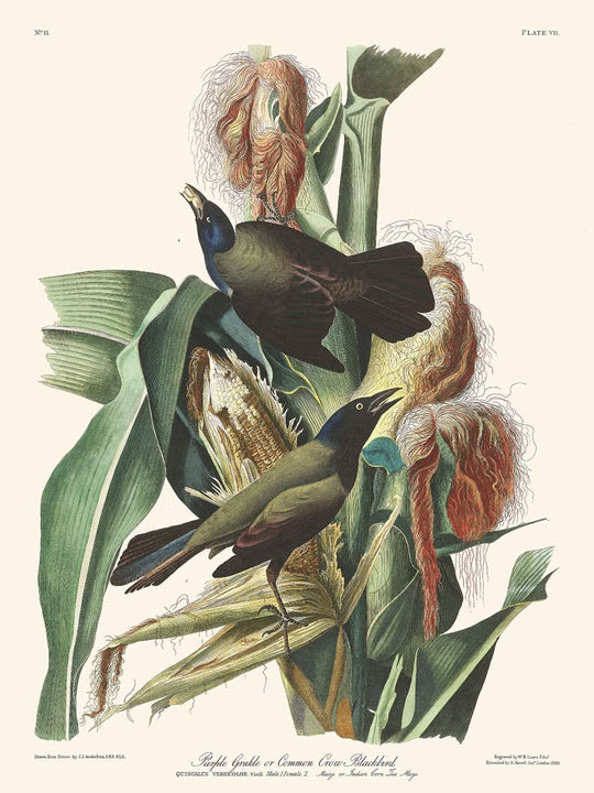 Purple Grakle, or Common Crow Blackbird, created by the renowned ornithologist and painter John James Audubon, was first published in 1827 as part of the groundbreaking collection, Birds of America. This illustration captures the rich plumage and intriguing behavior of the Purple Grakle, a bird that Audubon vividly describes engaging in its natural tendencies.