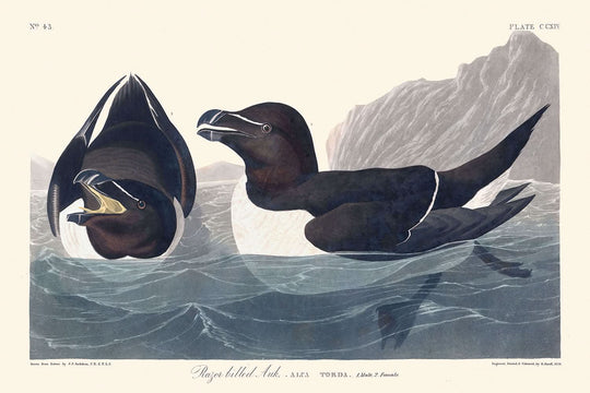 Razor Bill, first published in 1827, shines as one of the striking bird illustrations from John James Audubon’s legendary collection, The Birds of America. This particular artwork captures the beauty and elegance of the Razor-billed Auk, a bird known for its striking black and white plumage and unique habitats.