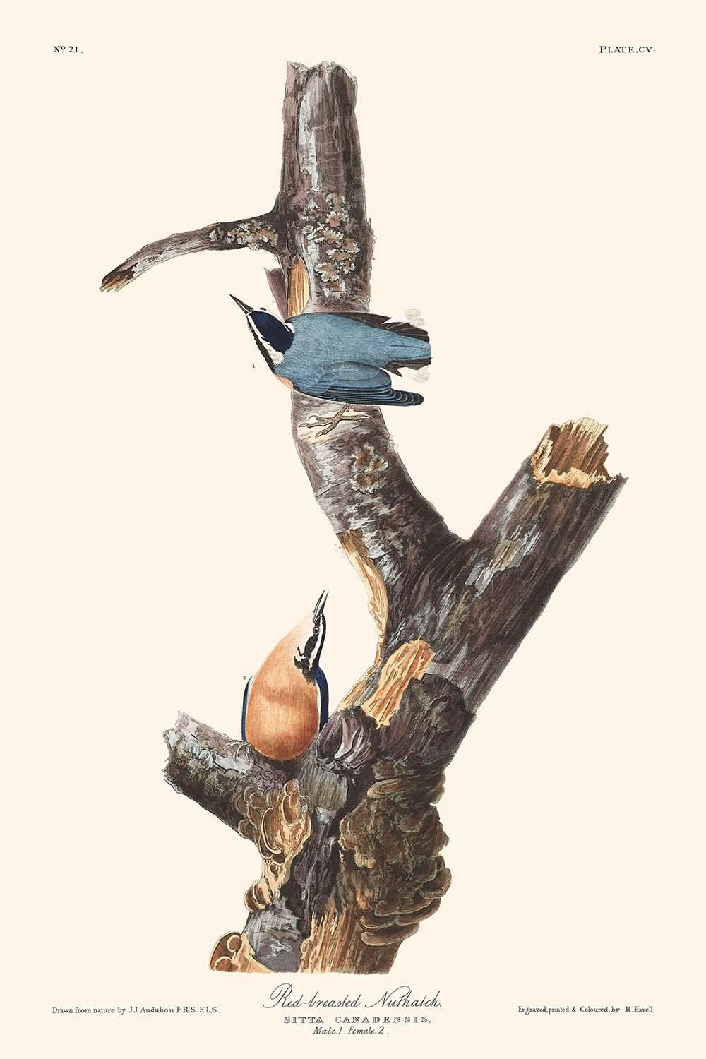 Red-breasted Nuthatch (Plate 105) by John James Audubon, first brought to life in 1827, is one of the captivating avian depictions from the renowned series, Birds of America. Audubon's ability to capture the vibrancy and life of his subjects is beautifully illustrated in this piece, which showcases the Red-breasted Nuthatch in its natural habitat.