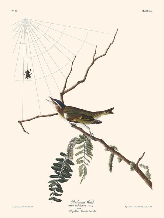 John James Audubon's "Red-eyed Vireo (Plate 150)," published in 1827, is a captivating bird illustration part of his renowned work, "Birds of America." This collection is celebrated for its life-size, intricately detailed hand-colored prints that beautifully capture the essence of American avifauna.