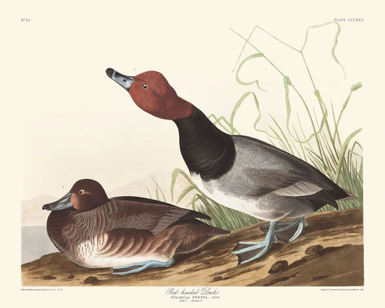 The use of color and style in "Red-headed Duck," notably its intense brownish-red head with carmine gloss, brownish-black neck band, and greyish-white feathers, demonstrate Audubon’s masterful control over his medium. These complementary hues and the detailed depiction of the duck's anatomical features — like Anas Fabina (scientific name) — are reasons enough to own this piece, providing both aesthetic pleasure and educational value.