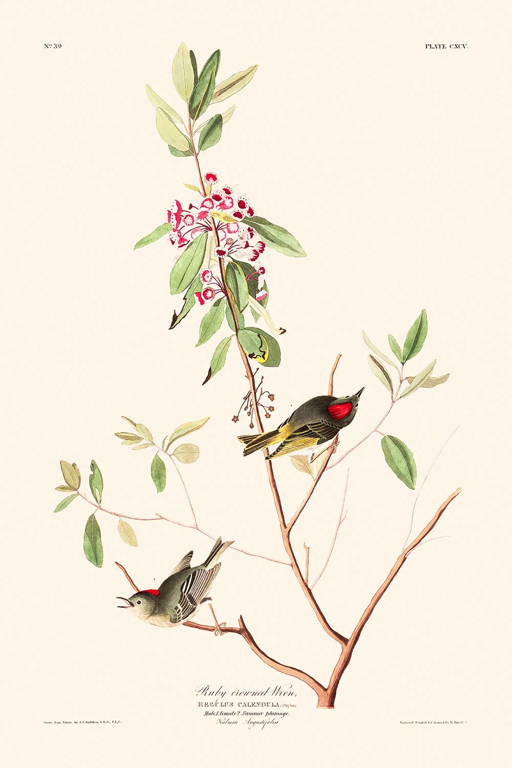 The illustration details highlight the bird’s vivid vermilion crown against its greyish-white underparts and dull olivaceous upper parts, brilliantly complementing the deep rose hues of the Laurel, or Kalmia angustifolia, upon which the bird is perched. The deft use of color enhances the captivating elements of this piece, making it an enticing example of Audubon's skill in capturing nature’s vivid hues and dynamic motions. This reverence for nature’s small wonders makes it a desirable addition for enthusiasts and collectors alike.