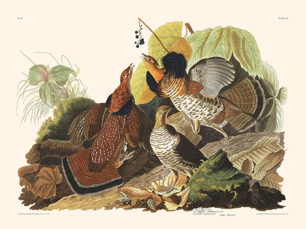 The Ruffed Grouse stands emboldened against a soft background, his plumage an intricate tapestry of earthy chestnuts and rich ambers, seamlessly interplayed with the verdant hues of the surrounding foliage, bringing warmth and grace to any space. This illustration draws upon Audubon’s unparalleled ability to weave scientific accuracy with artistic finesse, making it a remarkable addition for collectors and enthusiasts alike.