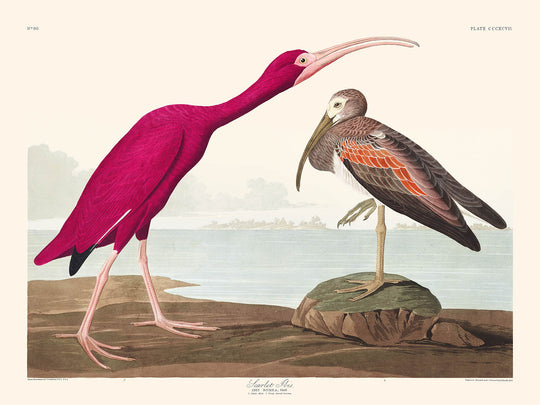 Notably, the Scarlet Ibis is celebrated for its resplendent scarlet plumage, complemented by stark white quills and bluish-black primary wing tips. Audubon emphasizes its striking color contrasts—vibrant scarlet juxtaposed with subtle hues that provide depth to the composition. This contrast is further enhanced by the pale lake tones of the bird’s bill and feet against the relatively subdued background—a testament to Audubon’s skill in balancing a scene rich in both detail and visual allure.