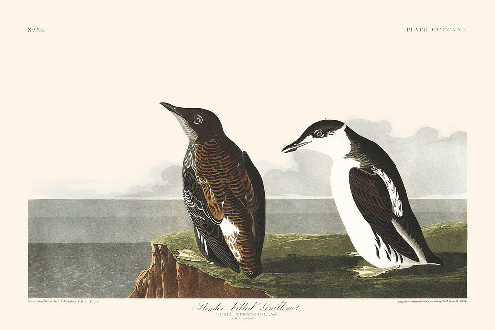 Slender-billed Guillemot by John James Audubon is a captivating ornithological artwork created in 1827 for his renowned "Birds of America" series. This piece illustrates the Slender-billed Guillemot (Uria Townsendii), capturing the detailed features and delicate nuances of this North American bird as observed near the Columbia River. Through Audubon's unparalleled craftsmanship, he documented two phases of the bird's development, highlighting the distinct changes that occur in its plumage over time.