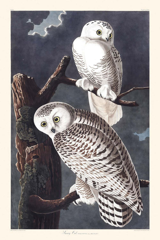 The "Snowy Owl" artwork stands out with its masterful use of color and composition. Audubon employs a primarily creamy white palette, accentuated by the owl's striking amber eyes and subtle black markings, reflecting the bird's natural grace and power. The owl is illustrated perched against a pale background, emphasizing its serene yet powerful presence, making it a compelling addition to a natural history collection or any space needing a touch of elegance and nature-inspired beauty.