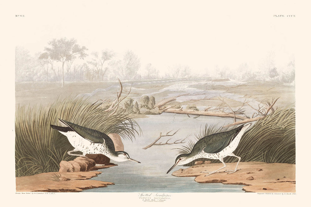 John James Audubon's "Spotted Sandpiper (Plate 310)" captures the exquisite beauty of the Spotted Sandpiper bird in a masterful illustration that stands as part of his renowned collection, "Birds of America," first published in 1827. Audubon, a pioneering American ornithologist and artist, is celebrated for his intricate and vibrant bird illustrations, each piece presenting not just the image of the bird but also a glimpse into its habitat and behavior, rendering his works significant both scientifically and artistically.