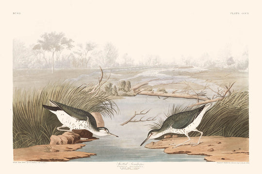 The artwork itself is a dazzling interplay of color and form. Set against a muted background that highlights the vividly decorated Sandpiper, its deep brownish-olive upper parts contrast with the intricate black markings and the white belly. This dynamic composition and attention to natural hues allow Audubon to create a lifelike portrayal, demonstrating his outstanding artistic skill and passion for the avian world, making this print an ideal piece for art aficionados and nature lovers alike.