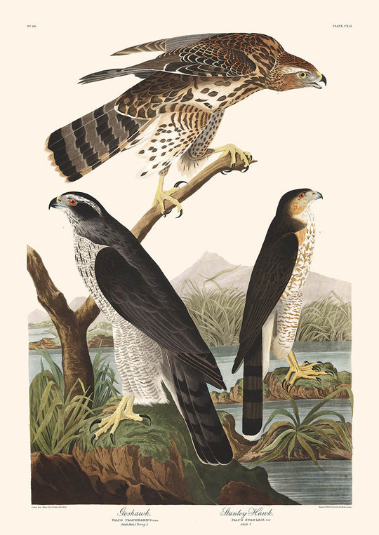 John James Audubon’s “Stanley Hawk” from 1827 is an exquisite illustration featured in his illustrious series, Birds of America. Audubon, an American ornithologist, and artist is renowned for his meticulous, life-sized depictions of North American birds. His works are celebrated for their combination of scientific accuracy and artistic beauty, capturing the vibrancy and elegance of avian species in their natural habitats.