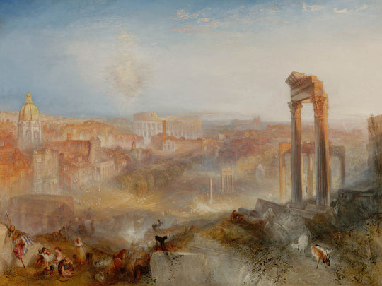 Modern Rome – Campo Vaccino by Turner is a luminous vision of Rome’s ancient heart, captured at the height of the artist’s mastery in 1839. Painted when Turner was already an internationally acclaimed landscape painter, this work presents the restored tranquility and golden light of the Roman Forum, reimagined through Turner's singular, atmospheric lens.