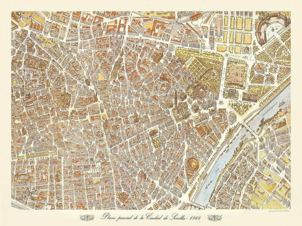 The "Plano Parcial de la Ciudad de Sevilla," created by Jose Loeches and Jose Ruiz Navarro in 1964, is a stunning birdseye view pictorial map that captures the essence of Sevilla with remarkable detail and artistry. This map, commissioned by the local tourism board, offers a three-dimensional depiction of the city's heart, elegantly illustrating its major buildings, squares, and streets. The map's orientation, with northeast at the top, provides a unique perspective that invites viewers to explore the rich tapestry of Sevilla's urban landscape.