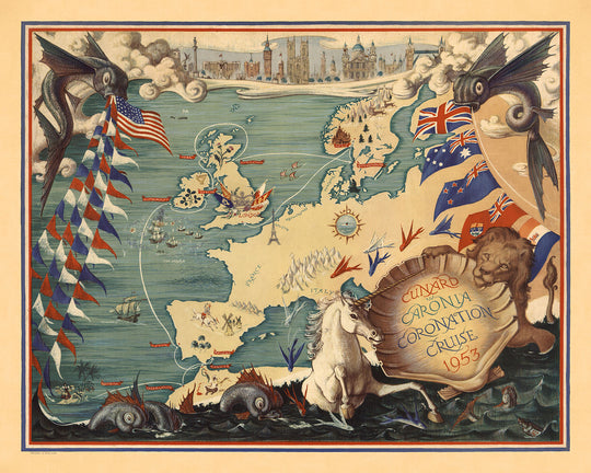 Historically, this map holds great significance as it commemorates a pivotal moment in British history—the coronation of Queen Elizabeth II. The map not only serves as a record of the cruise but also as a reflection of the cultural and historical context of the early 1950s. The depiction of iconic landmarks such as the Eiffel Tower and the inclusion of historical and mythical figures add layers of storytelling, providing a rich narrative of the era.