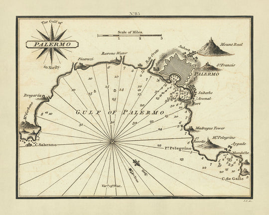 William Heather's contribution to the field of nautical charting with "The Gulf of Palermo in Sicily" chart underscores the evolution of cartographic techniques and the importance of accurate maritime mapping. As part of a broader effort to provide comprehensive navigational aids, this chart exemplifies the transition from rudimentary sketches to detailed and reliable guides for sailors navigating the complex waters of the Mediterranean. Owning this chart is akin to possessing a fragment of maritime history, immortalizing the rich tapestry of Sicilian and Mediterranean seafaring heritage.