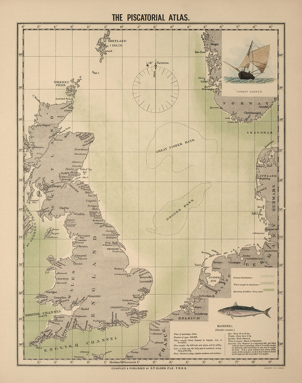 This rather unique map from the Piscatorial Atlas by O.T Olsen shows detailed information about the fishing in the North Sea at the end of the 19th century.