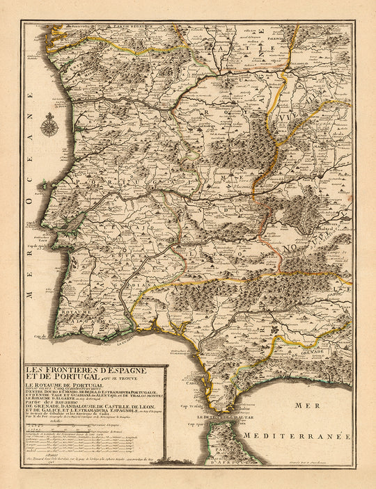 Old Map of Algarve & Gibraltar in 1742 by Nicolas de Fer: Cadiz, Malaga, Sevilla, Marbella, Lisbon, Portugal, Spain