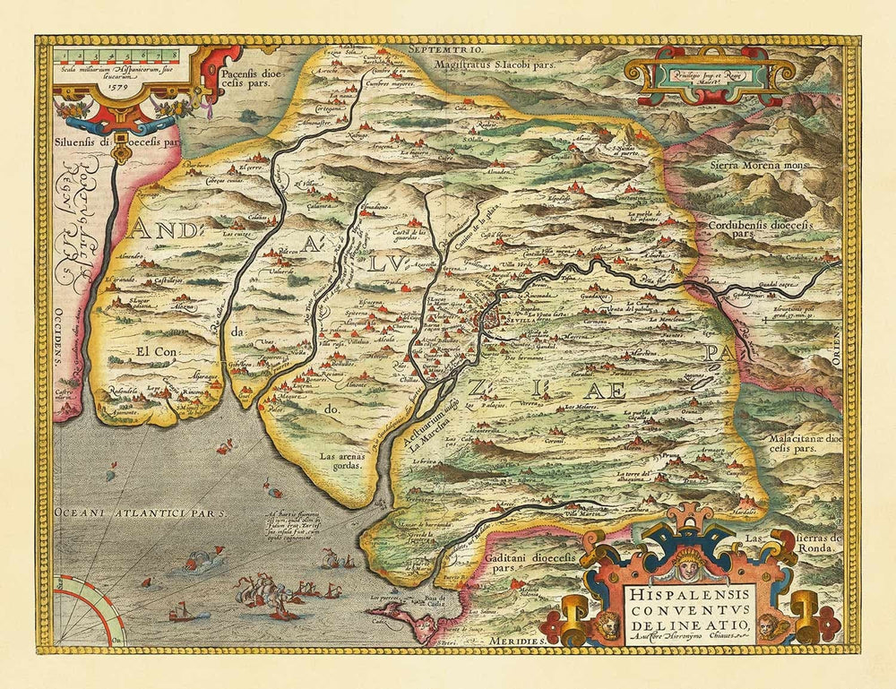 A delightfully characterful and exceedingly rare Abraham Ortelius map of southwest Spain, Andalusia, focused on the city of Seville. The map was originally published in 1573 as part of the Theatrum Orbis Terrarum, the first modern atlas of the world.