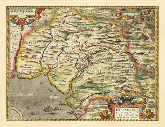 Old Map of Andalusia, Seville, Spain by Ortelius in 1573: Sevilla, Huelva, Cadiz, Barrameda, Santa María, Real