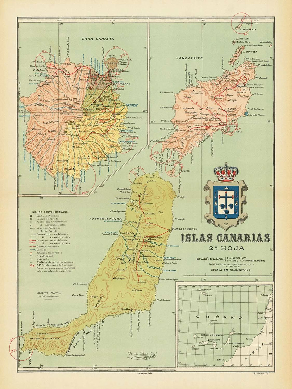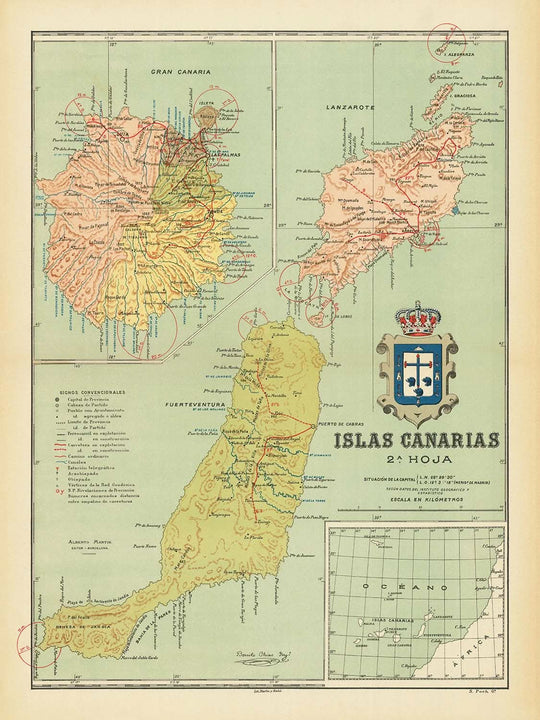 The "Islas Canarias 2a. Hoja" map, crafted by the esteemed cartographer Benito Chias in 1900, is a captivating glimpse into the geographical and political landscape of the Canary Islands at the dawn of the 20th century. This map intricately details three of the archipelago's major islands: Lanzarote, Fuerteventura, and Gran Canaria. Each island is rendered with precision, showcasing the delicate interplay between their rugged topographies and the burgeoning settlements of the era. The map is adorned with a large, ornate coat of arms, a testament to the rich cultural heritage of the region.