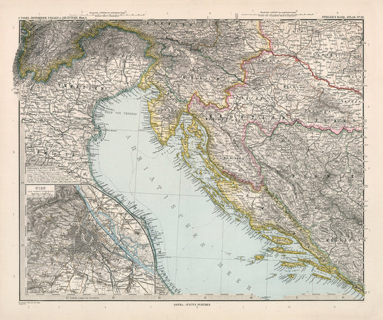 This old map of Croatia and Bosnia, originally created by Adolf Stieler in 1894, offers a glimpse into the rich history and captivating landscapes of these two countries. The map encompasses the breathtaking Adriatic Sea, showcasing the picturesque Dalmatian Coast and its numerous islands. One prominent feature is the Velebit Mountains, a majestic range that stretches along the eastern coast of Croatia. This map serves as a testament to the region's natural beauty and historical significance, making it a valuable addition to any collection.