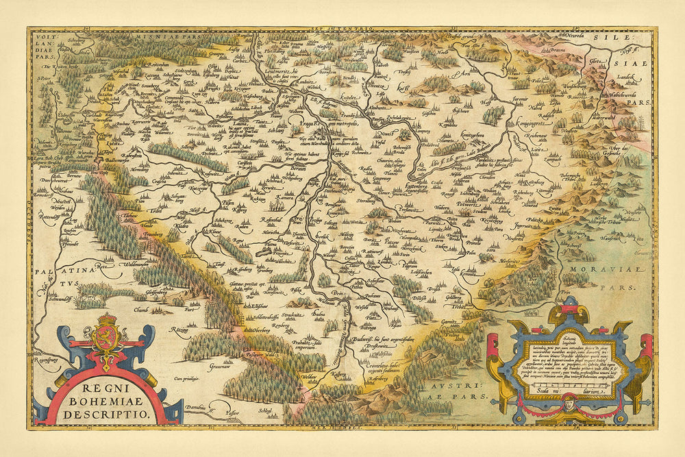 Old Map of Bohemia by Ortelius, 1579: Czechia, Prague, Vltava River, Forests