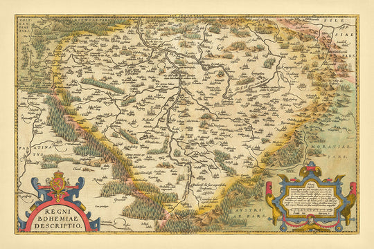 The "Regni Bohemiae Descriptio" is a testament to Ortelius' skill and vision as a cartographer. It serves as a window into the past, offering modern viewers a chance to explore the rich tapestry of Bohemia's geography and history. The map's combination of detailed cartography and artistic embellishment makes it a prized piece for collectors and historians alike, embodying the spirit of discovery and the quest for knowledge that defined the Renaissance era.