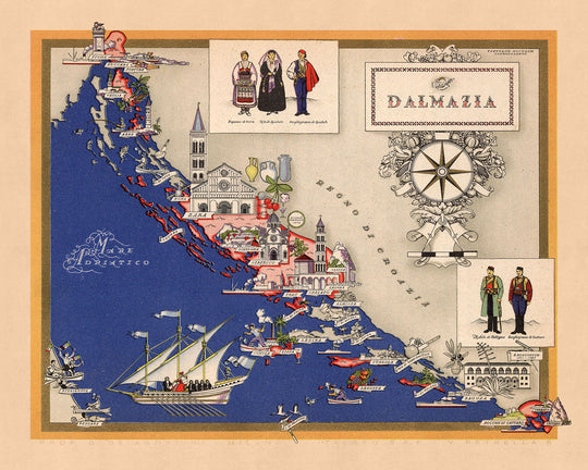 This map of the Italian Region of Dalmazia, originally published in 1938 by the Italian cartographic company, Istituto Geografico De Agostini, is a beautiful and detailed example of a thematic and pictorial map. The map covers the entire region of Dalmatia, which is located along the eastern coast of the Adriatic Sea and includes the modern-day countries of Croatia, Bosnia and Herzegovina, and Montenegro. At the time this map was originally published, Dalmatia was part of the Kingdom of Italy.