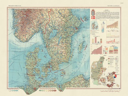 The map also includes ten smaller maps and graphics that complement the main map and provide additional insights into specific aspects of Denmark. These supplementary maps and graphics cover topics such as types of relief, climate, population, employment, industry, agriculture, animal products, and foreign trade. By incorporating these additional elements, the map becomes a comprehensive resource for anyone seeking a deeper understanding of Denmark and its surrounding areas.