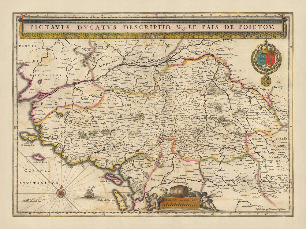Old Map of Duchy of Poitou, France by Visscher, 1690: Nantes, Angers, Poitiers, La Rochelle, Marais Poitevin Regional Natural Park