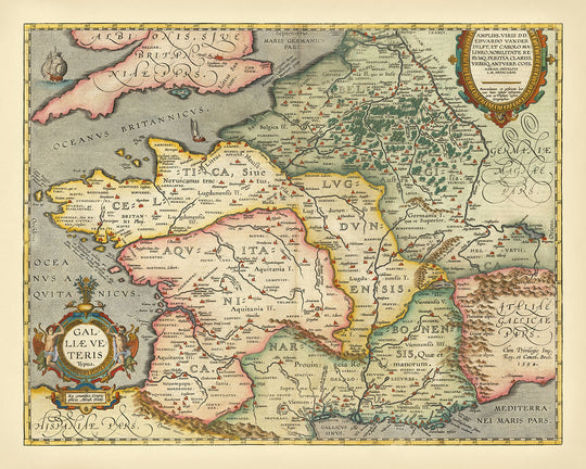 Among the notable features on this map are the cities of Paris (Parisii), Lyon (Lugdunum), Marseille (Massilia), and Bordeaux (Burdigala), each represented with miniature views that hint at their significance in ancient times. The map also highlights important bodies of water like the Mediterranean Sea (Mediterranei Maris pars) and the English Channel (Oceanus Britannicus), along with decorative ships sailing the northern waters. This intricate map is not just a geographical representation but a historical narrative, making it a valuable addition to any collection of classical antiquity or European maps.