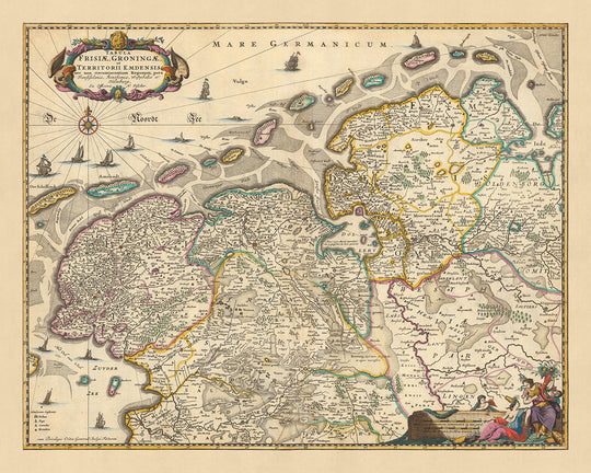 The full name of the map, 'Tabula Frisiae, Groningae, et Territorii Emdensis nec non circumjacentium Regionum, puta Transisalaniae, Benthemiae, Westphalae et Oldenburgi', translates to 'Map of Friesland, Groningen, and the Territory of Emden, as well as the surrounding regions, namely Transisalania, Bentheim, Westphalia, and Oldenburg'. This expansive coverage provides a comprehensive view of the northern Netherlands and northwestern Germany during the late 17th century.