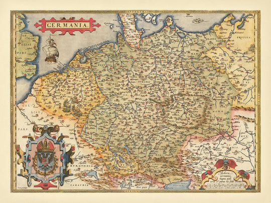 The artistic elements of "Germania" are as captivating as its geographical precision. The lower-left corner of the map features a coat of arms, likely representing Maximilian II, the Holy Roman Emperor, adding a regal touch to the cartographic work. The illustration of a ship in the English Channel and a sea monster in the Baltic Sea not only enhance the map's visual appeal but also reflect the maritime myths and artistic conventions of the era. These elements, combined with the old color palette, make the map a true work of art.