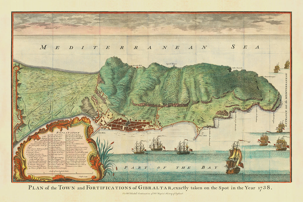 Old Map of Gibraltar by Paul de Rapin, 1745: Town of Gibraltar, Bay of Gibraltar, Strait of Gibraltar, Mediterranean Sea