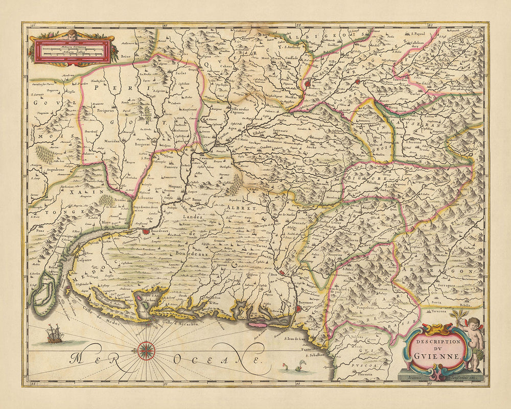 Old Map of Guyenne, France by Visscher, 1690: Toulouse, Bordeaux, Donostia-San-Sebastian, Pau, Pyrénées